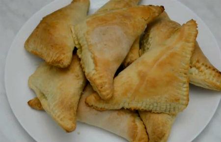 Приступаем к формированию конвертиков. Мы будем использовать тесто покупное, в форме прямоугольных пластов. Делим один пласт на четыре одинаковых части. Каждую из частей, слегка раскатываем скалкой. Выкладываем начинку по одну сторону квадратика, а другой стороной его накрываем, у нас получается конвертик треугольной формы. Чтобы края конверта при выпечке не разошлись, прищипываем их с помощью вилки. Так мы поступаем с остальным тестом. Готовые конвертики выкладываем на противень застеленный пергаментом и отправляем в заранее разогретую духовку выпекаться. Выпекать нужно до румяной корочки, 15-20 минут.
