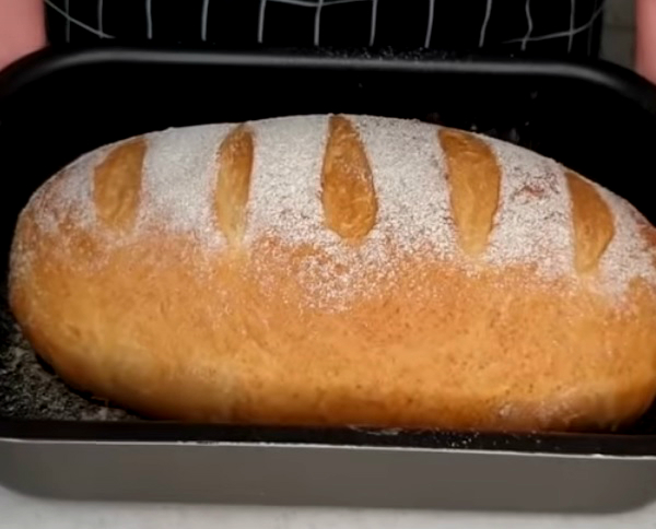 Перед выпечкой смазываем сверху молоком или обычной водой, присыпаем мукой и делаем не глубокие надрезы сверху. Теперь можно отправлять в предварительно разогретую духовку. Выпекаем хлеб 30-35 минут при температуре 180-190 градусов до золотистой корочки.