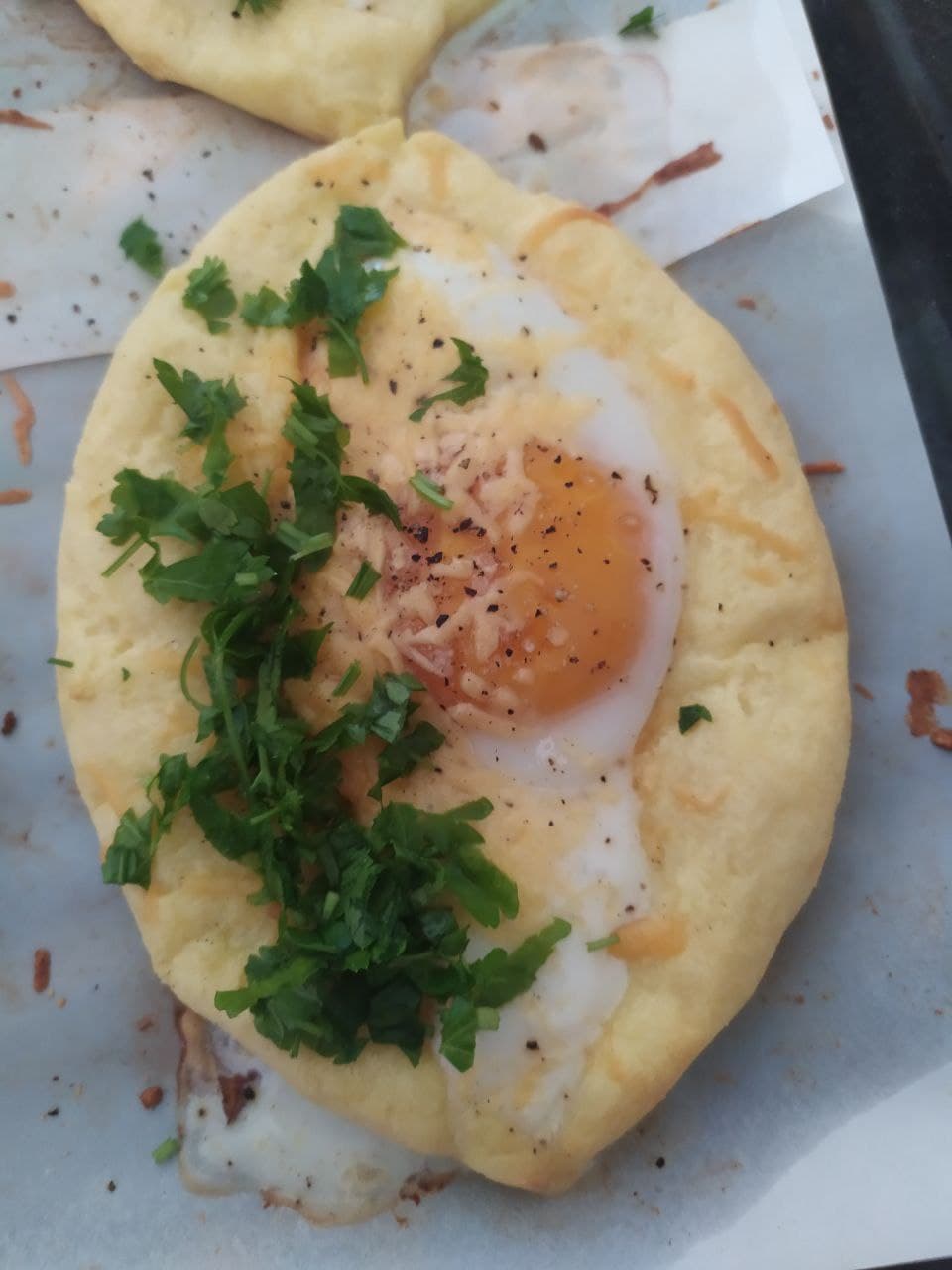 - Разогреваем духовку на 180 градусов и ставим в нее противень с творожными изделиями на 30 минут. После отведенного времени достаем хачапури и в каждое из них аккуратно разбиваем яйцо. Сверху немного солим и перчим, кладем остаток натертого твердого сыра. Ставим противень в духовку на 3 минуты.