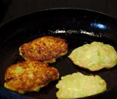 Кабачок натереть на крупной терке. Затем добавить муку, крахмал, сахар, соль, черный молотый перец, отруби, соду, гашеную в уксусе. Тщательно перемешать, тесто получается довольно густое. В сковороду налить растительное масло, нагреть. Тесто выкладывать ложкой. Жарить оладьи с одной стороны до золотистого цвета на среднем огне. Перевернуть оладьи на другую сторону и также жарить до золотистого цвета. Вкусно со сметаной.
