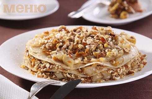 6.В подходящей тарелке выкладывают блины, чередуя кремом из груши и орехами.