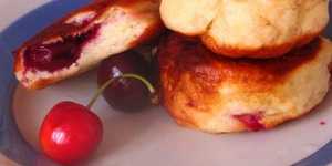 Тесто делим на две части, раскатываем. Стаканом вырезаем кружочки и укладываем вишню (сок сливаем).