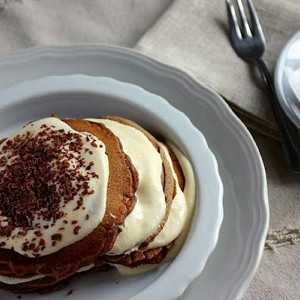 6. Нагрейте сковороду и на масле пожарьте блины. Выложите готовые блины на тарелку. Между каждым блином нанесите крем. Сверху выложите оставшийся крем и слегка присыпьте какао. Охладите перед подачей.