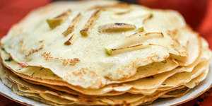 Пока тесто не успело полностью схватиться, посыпать яблочной соломкой. Она должна прилипнуть к мокрому тесту. Перевернуть блин и жарить еще несколько секунд. Горячий блин посыпать сахаром или сахарной пудрой.