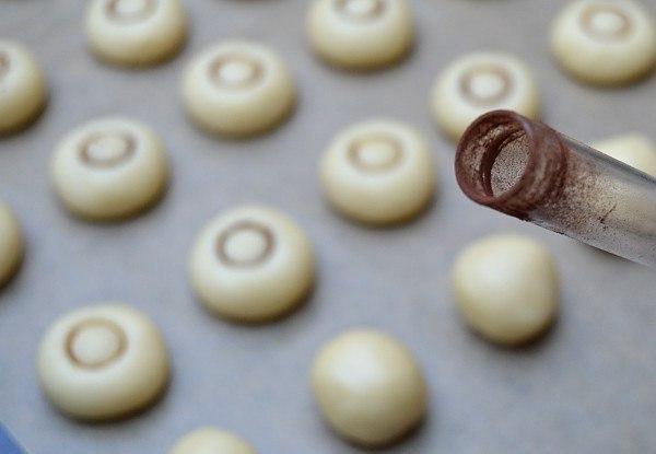 4. Делим тесто на 46-48 шариков, выкладываем на противень с бумагой. Один конец небольшой трубочки опускаем в какао и надавливаем глубоко посередине каждого шарика, формируем ножку грибочка.