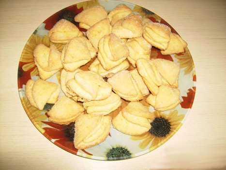 Раскатайте тесто тонким листом и вырежьте с помощью стакана кружочки. Макайте одну сторону кружочка в сахарный песок, сворачивайте его пополам, сахаром внутрь, и снова обмакивайте в сахар, складывая сахаром внутрь. Выкладывайте печенье на противень, смазанный растительным маслом или выстланный бумагой для выпечки. Выпекайте 15-20 минут при температуре 200 градусов.