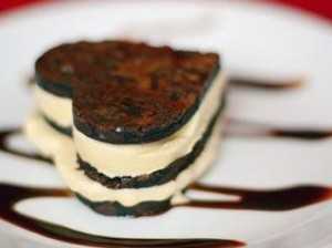 На 6 сердечек выдавить поровну мусс, сложить один на другой в две тарелочки. Сверху положить сердечко без мусса, осторожно, чтоб не поломать. Украсить засахаренными цветами и подавать.