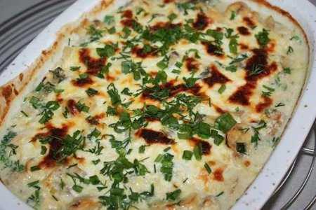 Поставить разогреваться духовку до 200 градусов. Пока она будет разогреваться, подготовим грибы. Лук нарезать квадратиками, шампиньоны, если крупные, то порезать пополам или на четвертинки. Сыр потереть на терке и смешать со сметаной. Разогреть в сковороде 2 ст. л. масла. Обжарить лук с шампиньонами. Добавить бульона (и вина) и потушить минуты 3-4. Добавить 2/3 сметанно-сырной смеси. Посолить, поперчить. Порубить немного зелени и добавить к грибам. В форму для запекания переложить грибы. Сверху выложить остаток сметанно-сырной смеси. Отправить в духовку на минут 15. За это время сыр подрумянится до золотой корочки. Готовые грибочки посыпать зеленью. Вот пожалуй и все. вкусно в сочетании с картофелем.
