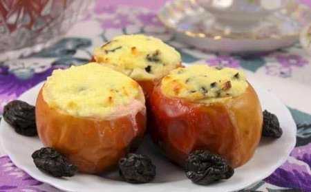 Приготовьте необходимые ингредиенты. Вам понадобятся яблоки, сыр, чернослив, яйцо и сахар. Чернослив запарить в горячей воде на 10-15 минут. Порезать небольшими кусочками. Творог смешать с сахаром и яйцом. Добавить к творогу чернослив и хорошо перемешать. Яблоки помыть и вырезать сердцевину у каждого яблока. В середину яблок выложить сыр с черносливом.