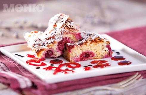 2. На тесто разложить вишни. Посыпать миндалем и сахарной пудрой. Пирог выпекать 25 минут в духовке, разогретой до 180 ° С. Охладить, удалить из формы и подавать политым вишневым сиропом.