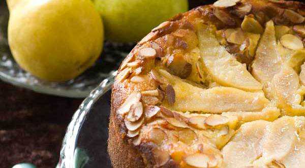 6. На верх пирога посыпать порезанный миндаль. Выложить кружочком груши и полить сверху медовой или сиропно/масляной смесью.