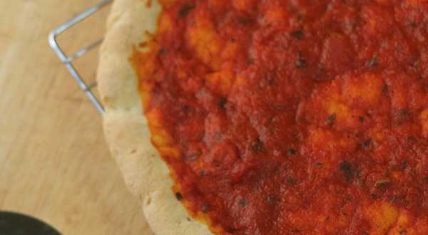 3. Установить нагрев духовки на 220 градусов (425F). Смазать жиром форму для выпечки с бортиками размером примерно 25Х 38 см или круглую размером в диаметре около 30 см. Вылить тесто в середину формы и распределить его по краям так, чтобы получились бортики пиццы. Для этого я чайной ложкой провожу по периметру теста, формируя края.