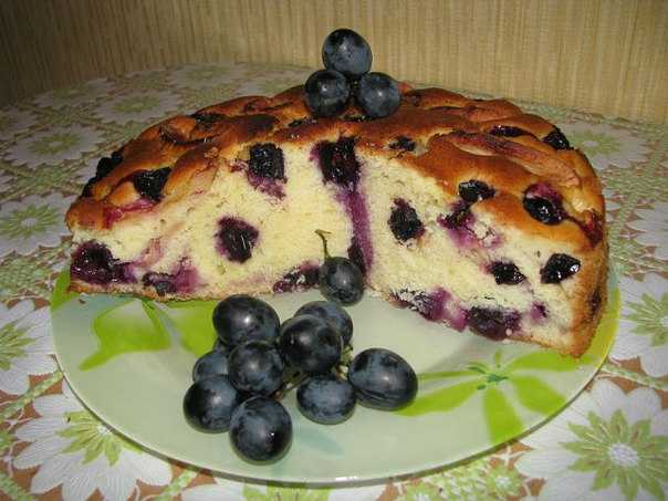 Из муки, сахара, кефира, яиц, маргарина, соды (гашеной) замесить тесто. Яйца взбить с сахаром, затем добавлять другие ингредиенты. Тесто получается жидким. Форму смазать маргарином. На дно формы вылить 1/3 получившегося теста и поставить на 15 мин. в духовку при маленькой температуре. Виноград отделить от кисточек. Вынуть форму из духовки и на пирог выложить виноград на расстоянии 1-2 см от боковых стенок формы. Полить сверху медом. Потом все равномерно залить тестом и поставить в духовку на 30-40 мин. при 200 °.