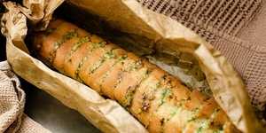 Булку заворачиваем в бумагу, как конфеты и отправляем в разогретую до 190 градусов духовку на 20 минут. Подаем на стол, прорезав до конца ломтики. Красиво на доске и прямо в этой бумаге.