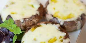 Посыпать грибы сыром. Вернуть противень в духовку и запекать пока сыр не расплавится. Переложить грибы на тарелку и подать к столу.