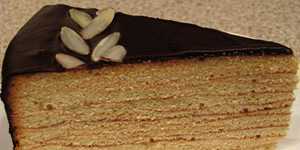 Не передержите! Тесто очень быстро горит! Достаньте форму, положите сверху еще 2 ложки теста, размажьте, поставьте под гриль до золотистого цвета, опять достаньте-размажьте тесто- под гриль… и так до того момента пока не закончится тесто. Обычно удается сделать 16 – 20 слоев.