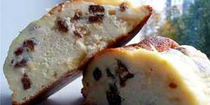 Взбить творог со сметаной сахаром, яйцами. Добавить просеянную с разрыхлителем муку и еще раз взбить. С лимона снять цедру. Изюм промыть теплой водой. Добавить в творожную массу и перемешать.