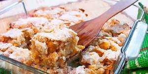 5. Готовый пирог вынуть, дать немного постоять и нарезать на квадратные или прямоугольные кусочки. Посыпать сахарной пудрой.