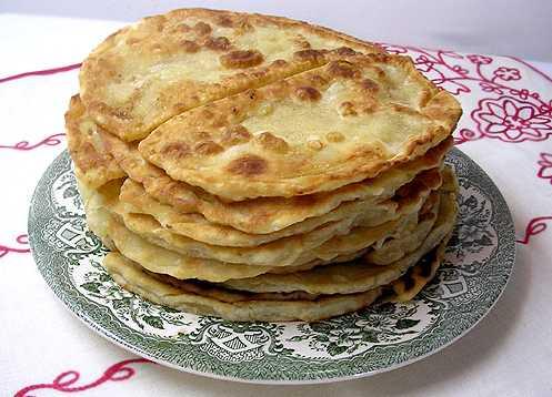 Замесите густое тесто, сделайте шарики, а из них раскатайте тонкие кружочки (сканцы), диаметром около 10-15 см. На одну половину круга насыпьте сахар (чуть больше половины чайной ложки) и аккуратно разровняйте его. Края смочите водой, защипните и жарьте на растительном масле с двух сторон.