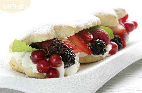 2. Теплыми разрезать пополам, наполнить сливочным сыром, взбитыми со сливками и медом, положить смесь ягод.