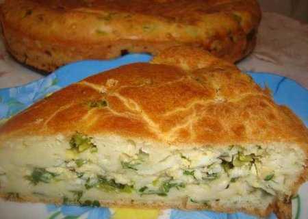 Взбить кефир с яйцами, добавить соль, соду, муку, чтобы получилось тесто, как очень густая сметана, добавить порезанную мелко зеленый лук в тесто (горсть). Начинка: вареные яйца потереть на крупной терке и добавить остатки зеленого лука, посолить , поперчить. Вылить на противень половину теста, положить начинку, положить на начинку кусочки сливочного масла и залить оставшимся теста. Выпекать до золотистой скоринкина маленьком огне.
