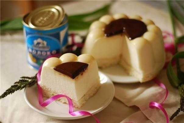 Охлажденные белки взбиваем с лимонной кислотой. Когда пена уже будет довольно крепкой, постепенно всыпаем к белкам оставшийся сахар и продолжаем взбивать до крепких пиков. На минимальных оборотах миксера тонкой струйкой вливаем желатин с сахаром. Отставляем на время. Взбиваем масло со сгущенным молоком. На малых оборотах миксера вводим эту смесь в белки. Форму в которой будет застывать торт смажем маслом и присыпим сахарной пудрой (лучше сделать все заранее, в том числе подготовить корж, не давать белковой массе стоять, вливать ее сразу, чтобы сгущенка не начала оседать. я с этим столкнулась).