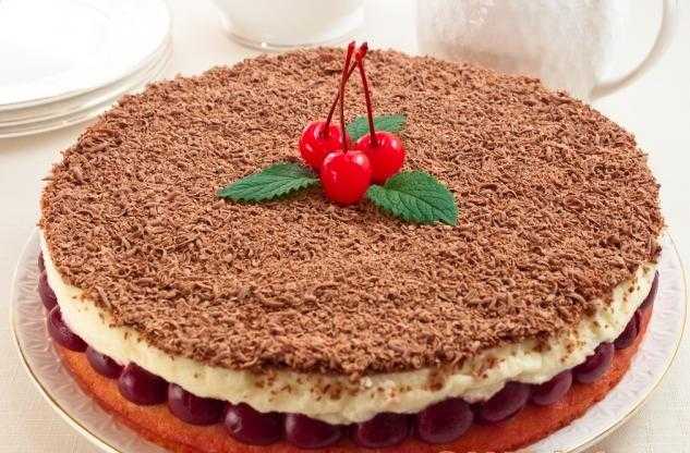 Приготовить крем. Для этого сливки взбить с сахаром. Добавить маскарпоне, перемешать. Выложить крем на вишню. Шоколад натереть на мелкой терке. Посыпать пирог шоколадом. Поставить в холодильник на 3-4 часа.