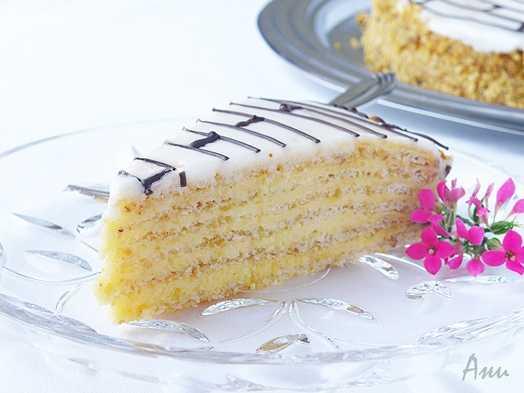 Возьмите нижний корж, снимите бумагу, положите на картон. Нанесите тонкий слой крема, накройте следующим коржом, пока не использует все 6. Оставьте немного крема для сторон торта.