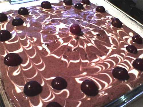 Выпекать в духовке со средним жаром. Бисквит разрезать вдоль пополам, из одной части вынуть вилкой весь мякиш, оставляя только основу из корок. Вынутый мякиш растереть с 1/3 всего количества крема, затем перемешать с половиной вишен, разделить пополам и уложить обратно в «коробочку», смазанную кремом изнутри.
