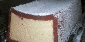 Готовый корж аккуратно выложить на полотенце посыпанное сахаром и снять бумагу. Дать остыть и порезать на куски по размеру формы (форма размерами 23*7,5 см и 7 см. в высоту).