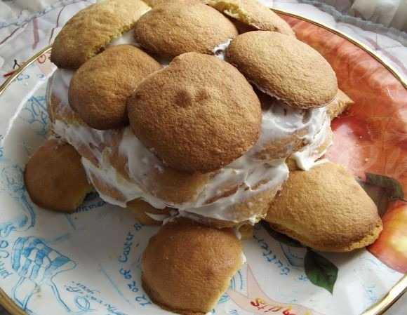 Сложите бисквитные «оладьи» в форме черепахи (туловище, ноги, голова, можно и хвост) и смажьте их кремом. Оставьте 2-3 ложки крема для окончательного оформления. У вас должна получиться вот такая картина: