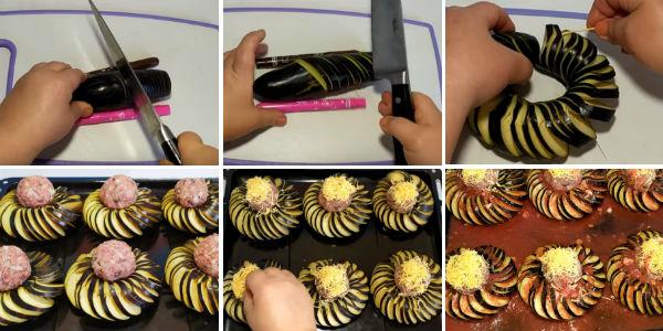 Итак, приступим. На заранее вымытых баклажанах удаляем плодоножку. По краям, в качестве ограничителей устанавливаем обычные фломастеры. С помощью острого ножа делаем по всей длине надрезы не до конца. Далее переворачиваем овощ на другую сторону, надрезами вниз и также с помощью ограничителей делаем надрезы, но уже наискосок (под углом 45 градусов). У нас получается баклажан в виде пружинки, края которого мы фиксируем шпажкой. Таким образом, подготавливаем все баклажаны порционно. Далее выкладываем готовые пружинки на противень.