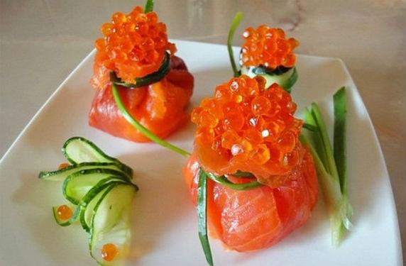 Далее аккуратно раскрываем середину мешочка и добавляем в него красную икру, можно черную. Икры нужно класть столько, сколько позволяет ваш мешочек. Таким образом мы делаем закуски столько, сколько необходимо. Выкладываем новогодние мешочки на красивое блюдо и можно подавать к столу. Для красоты, такое блюдо можно украсить тоненькими дольками лимона, листьями салата или веточками зелени. Приятного всем аппетита и праздничного настроения!