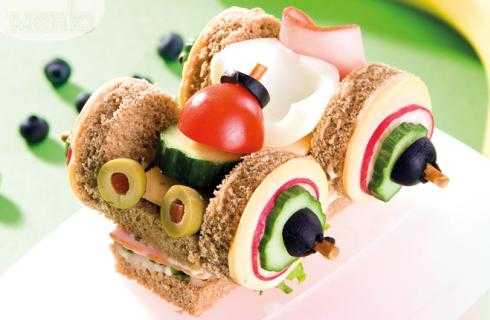 1. Из одного ломтика хлеба вырезать 2 прямоугольных куска 4х12 см, соединить со сливочным сыром, салатом, ломтиком ветчины и сыра. 2 палочки длиной 6 см, нанизать шины - ломтики хлеба, ветчину, огурцы, редис и маслины. Шины и колеса размещаются на кусках хлеба.