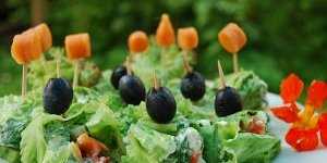 Огурцы нарезать кружками. Рулет порезать на кусочки 4-5 см шириной, скрепить с огурцом зубочисткой, сверху украсить маслиной или морковкой.
