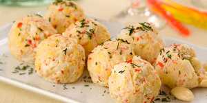Из полученной массы сформуйте шарики, в каждый вложите по оливке. Запанируйте шарики в тертом крабовом мясе и выдержите 20 минут в холодильнике.