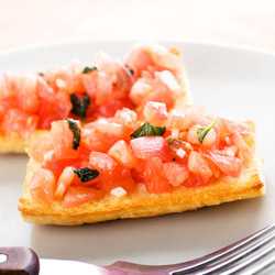 Пример здорового бутерброда итальянская Брускетта - поджаренные ломтики, натертые чесноком и посыпаные специями, с помидорами.