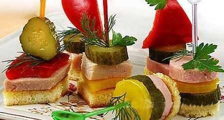 На кусочек хлеба кладем кусочек мяса, кусочек болгарского перца, соленый огурец, украшаем зеленью и скрепляем шпажкой или зубочисткой.