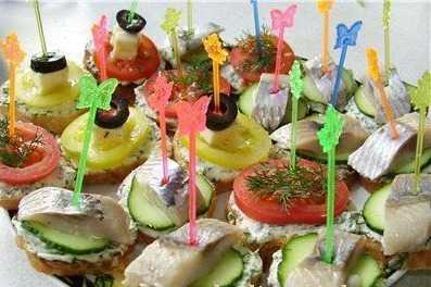 Зелень измельчить и смешать с мягким сливочным маслом. Ломтик хлеба смазываем маслом, кладем ломтик помидора или огурца, кусочек вареного яйца и кусочек сельди. Скрепляем шпажками или зубочистками.