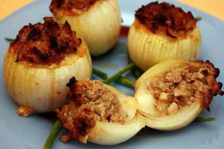 В каждую луковицу надо насыпать 1/2 ч.л. крахмала перед тем, как класть в них фарш. Затем луковицы заполнить фаршем с горкой и положить в огнеупорную посуду, смазанную маслом. Лук запекать в духовке около 30 минут при 180 градусах.