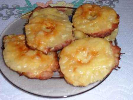 Приготовить фарш, как на котлеты. Лук спассеровать на масле. Картофель натереть на крупной терке, посолить, перемешать. Яйца отварить, мелко порезать, поперчить, добавить 1 ст.л. майонеза, перемешать. Сыр натереть на крупной терке. Сделать из фарша небольшие круглые лепешки (диаметр 10см). Выложить на противень, смазанный маслом. Сверху выложить слой жареного лука. Затем слой отваренных и порезанных яиц. Сверху положить натертую картошку в виде стожка. Сверху слой натертого сыра и майонеза.
