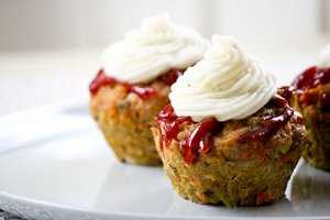 Смазать 12 форм для кексов. Разделить смесь равномерно. Сверху намазать кетчупом (или соусом барбекю). Выпекать их в течение 25 минут. Подавать с картофельным пюре.