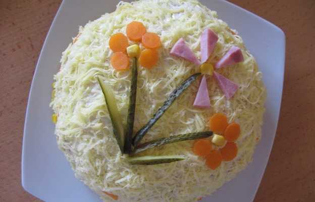 Продукты для начинки измельчите и укладывайте в случайном порядке между блинами, покрывая слоем майонеза. Сверху смазать торт майонезом и натереть сыр.