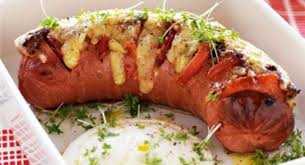 Прорезаем сардельки вдоль, не дорезая до конца. Наполняем каждую щель соусом.