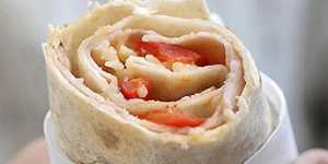 1. Уложить лепешки на стол. Положить в середину 1-2 кусочка ветчины. Посыпать сверху нашинкованным перцем и сыром, оставив 2 см до края. Начиная с одного конца завернуть рулетом. Затем завернуть рулет в фольгу и закрутить края. Можно хранить в холодильнике до 3х дней.