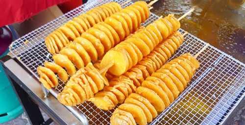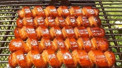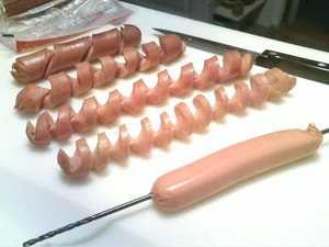 Например, сосиска: наденьте ее шампур и начинайте надрезать, потихоньку поворачивая шампур по часовой стрелке. При этом старайтесь не прорезать сосиску до шампура. Теперь можете ее жарить или варить.