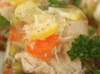Как только смесь застынет, положите курицу и остальной бульон с желатином.