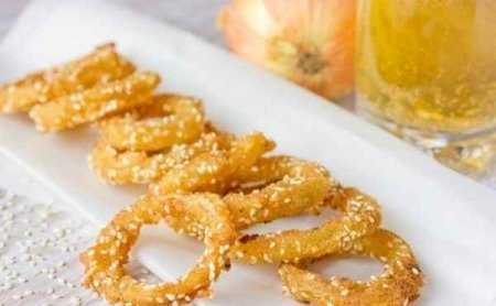 Для приготовления хрустящих луковых колец нам понадобится большая луковица, пшеничная мука, кукурузная мука, панировочные сухари, белый кунжут, соль , черный молотый перец, подсолнечное рафинированное масло для фритюра, вода кипяченая. Лук чистим, нарезаем кольцами, разделяем на отдельные кольца.