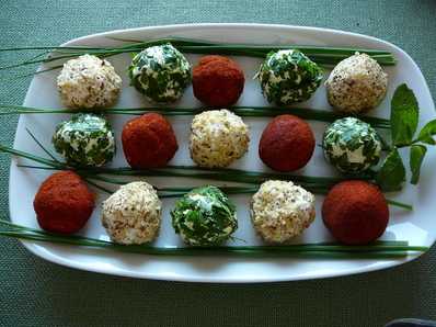 В трех отдельных мисках насыпать паприку, измельченные грецкие орехи и мелко нарезанную петрушку. Брать шарики и обваливать их в содержимом мисок, они получаются разного цвета. Положить в холодильник ,перед подачей на стол вынуть их из холодильника и выложить на тарелку.