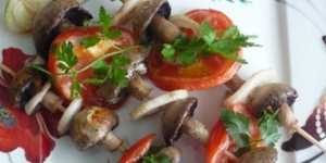 На шампуры накалываем грибы, помидоры и лук. Готовые шампуры выкладываем на противень, застеленный пергаментом. Ставим в духовой шкаф на 20 минут при температуре 220 градусов. Если есть возможность, то готовить на мангале до готовности.